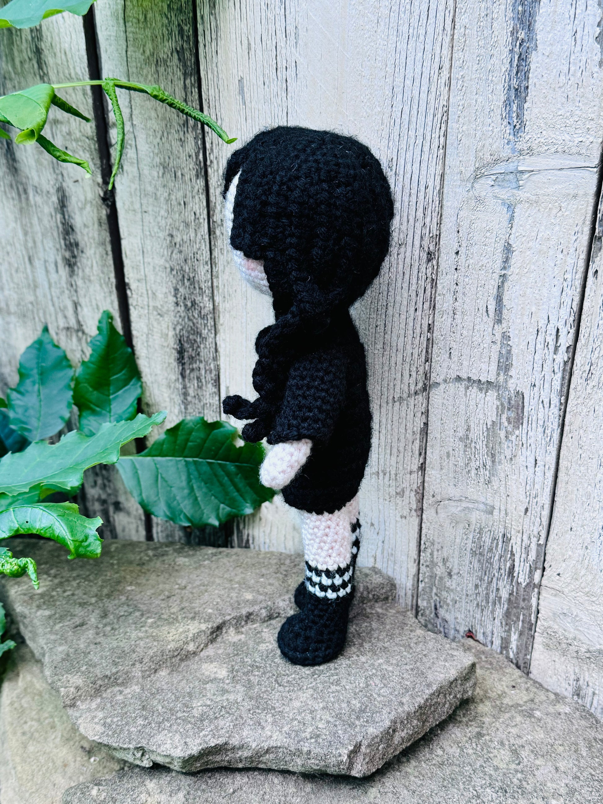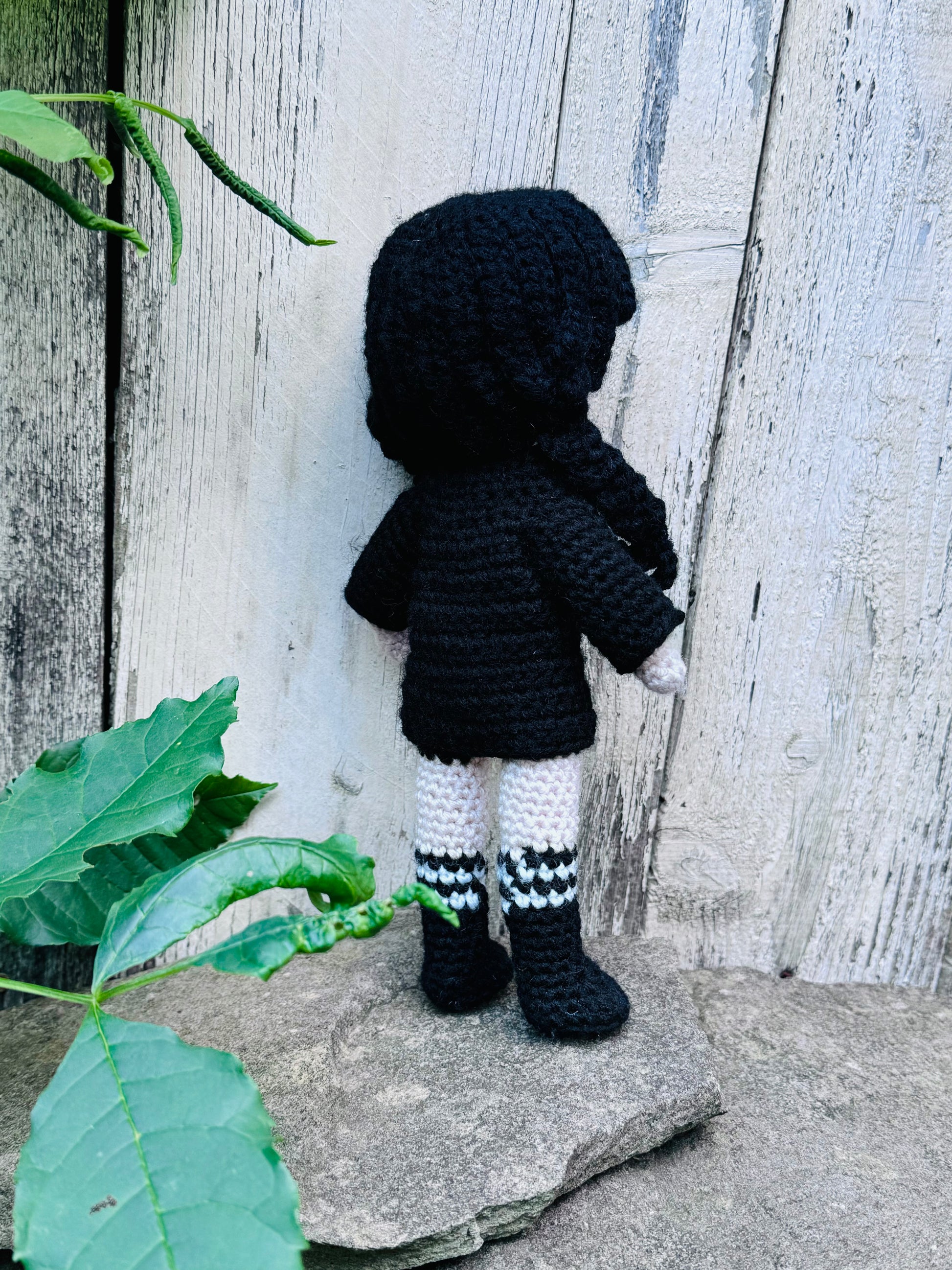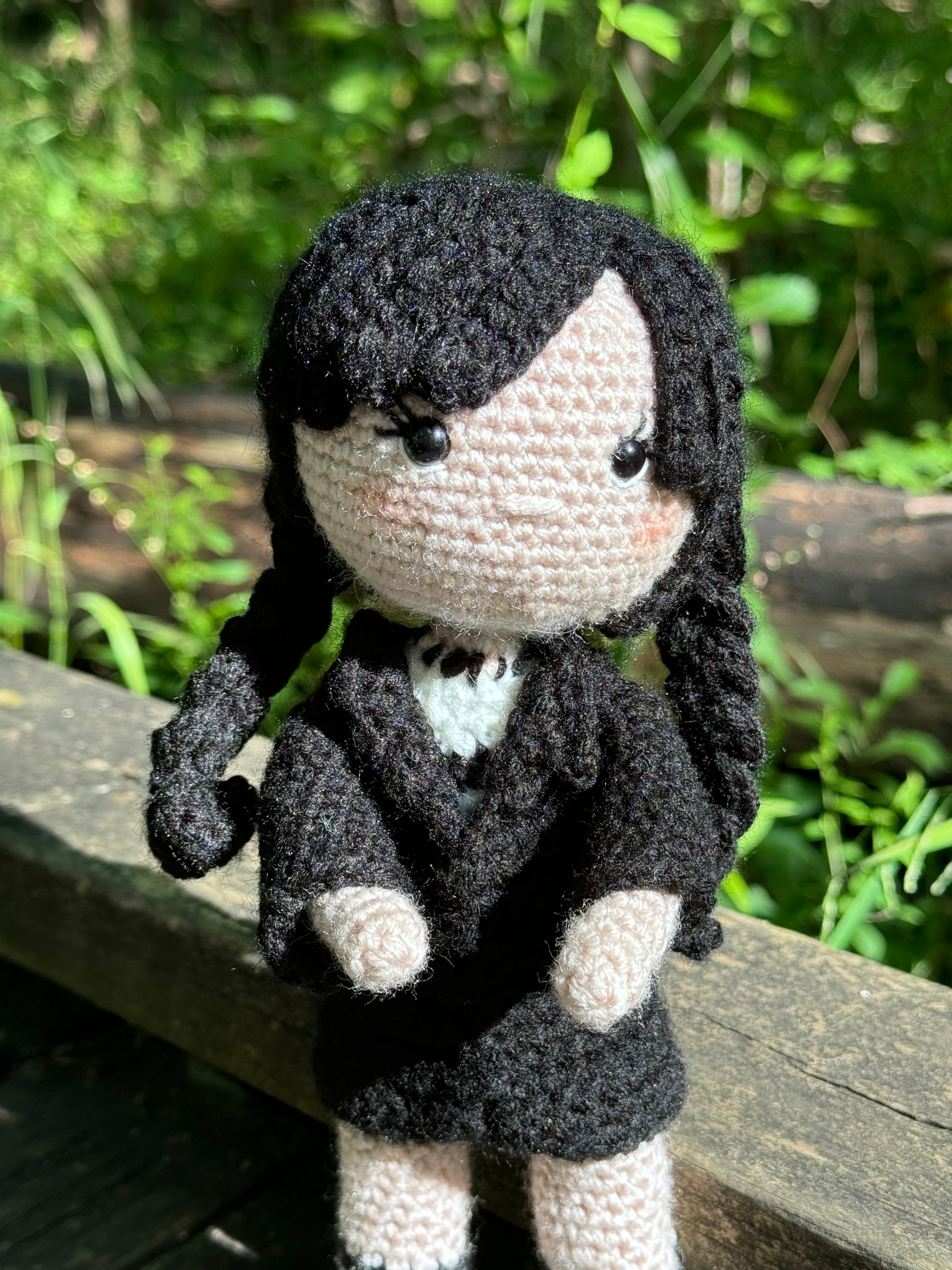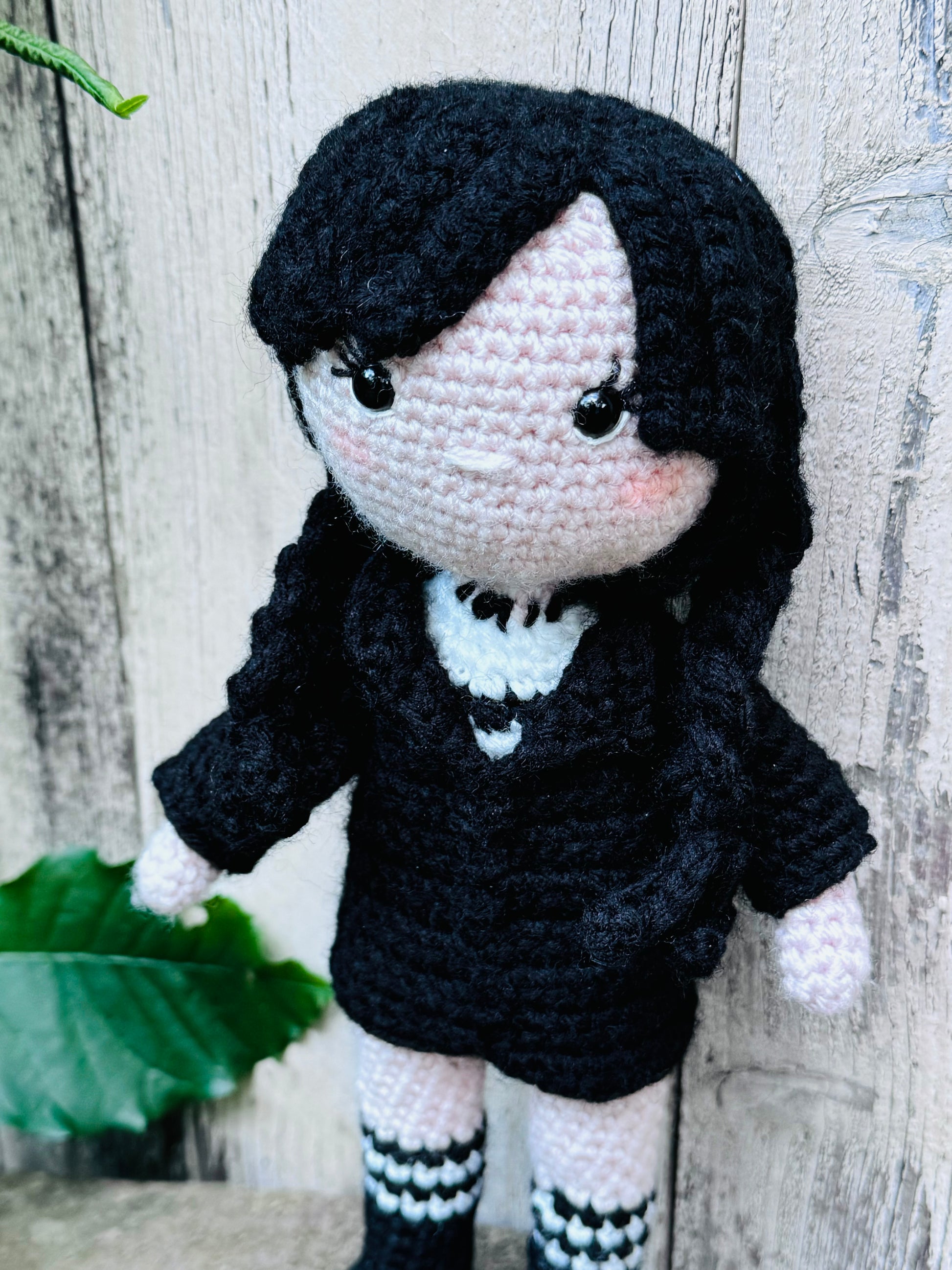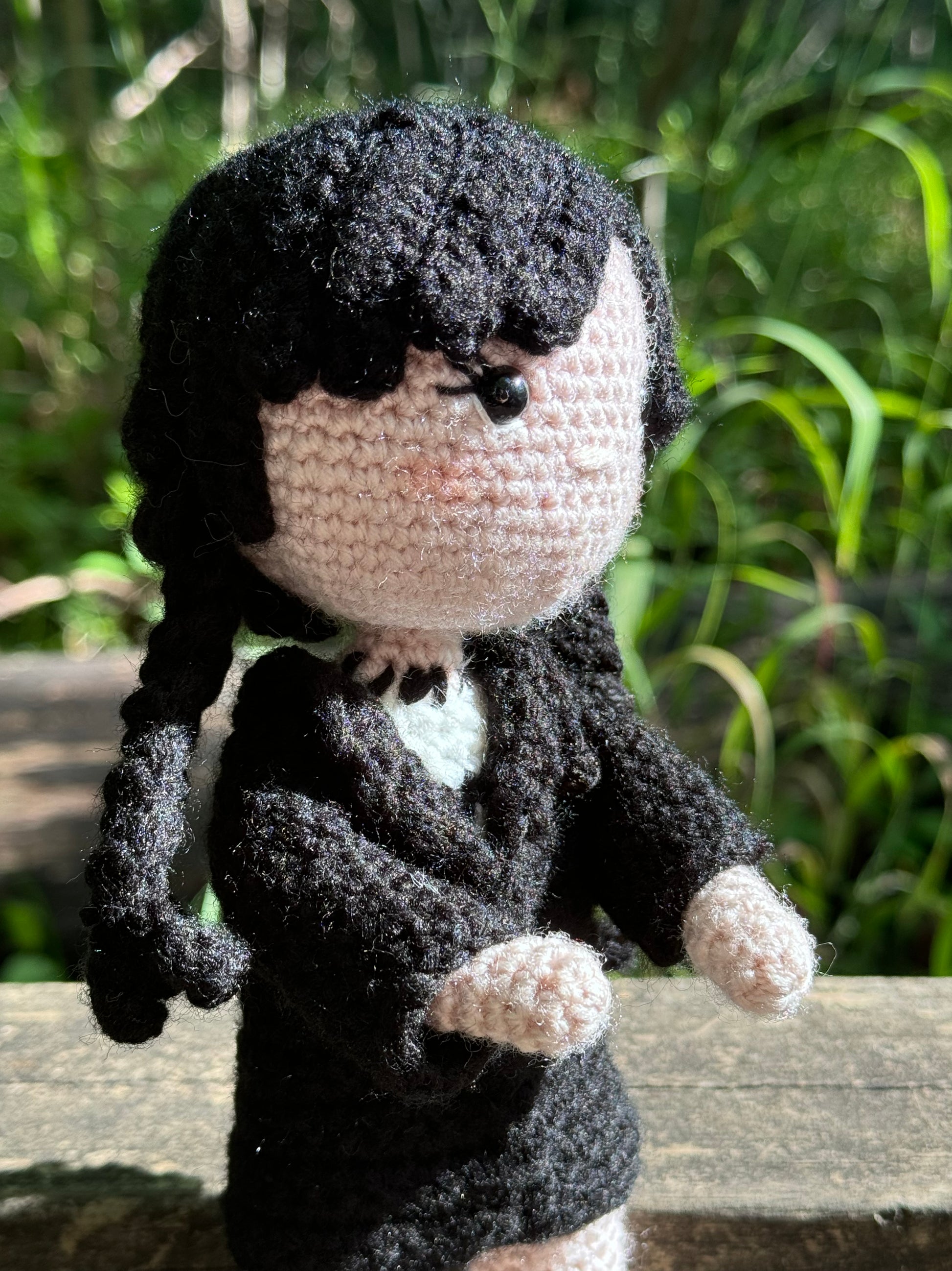Introducing Wednesday Addams! She's a cute crochet doll made with love. She is around 10 inches tall with posable arms; which makes her great for hugging and playing with. Each doll is made specifically for each order to make sure that every little detail is perfect. To keep Wednesday in top shape just wash her gently in cold water and let her air dry.