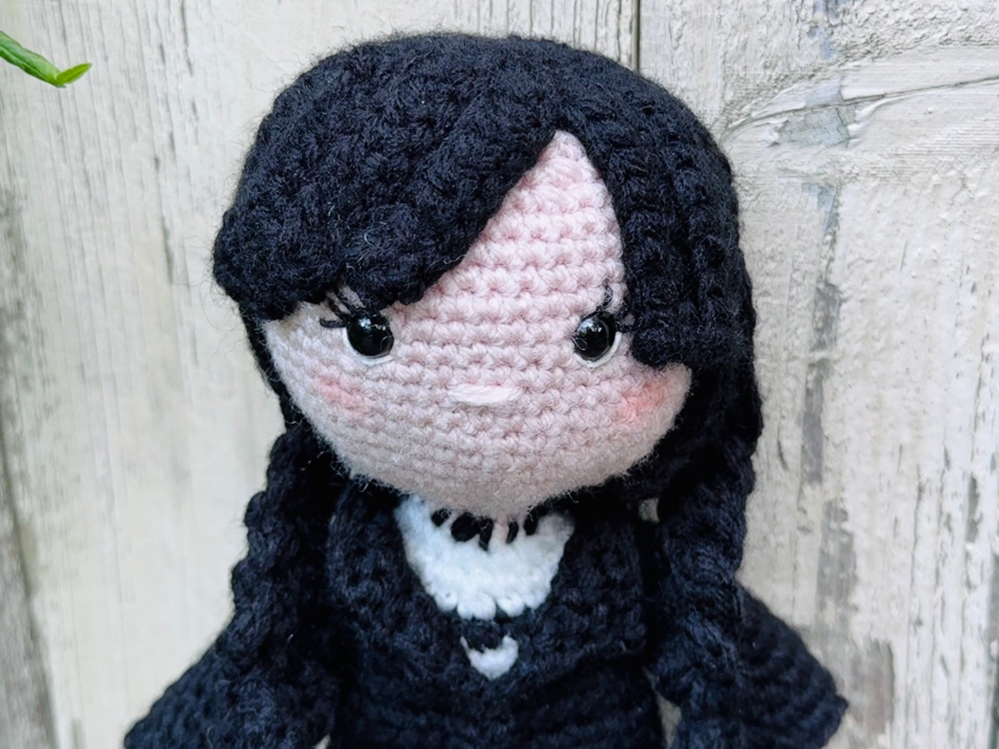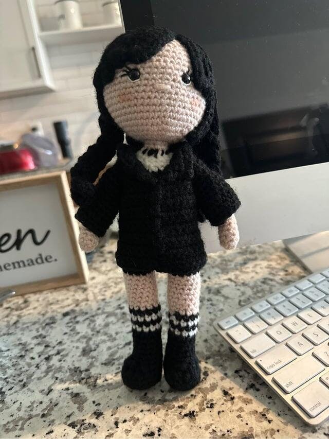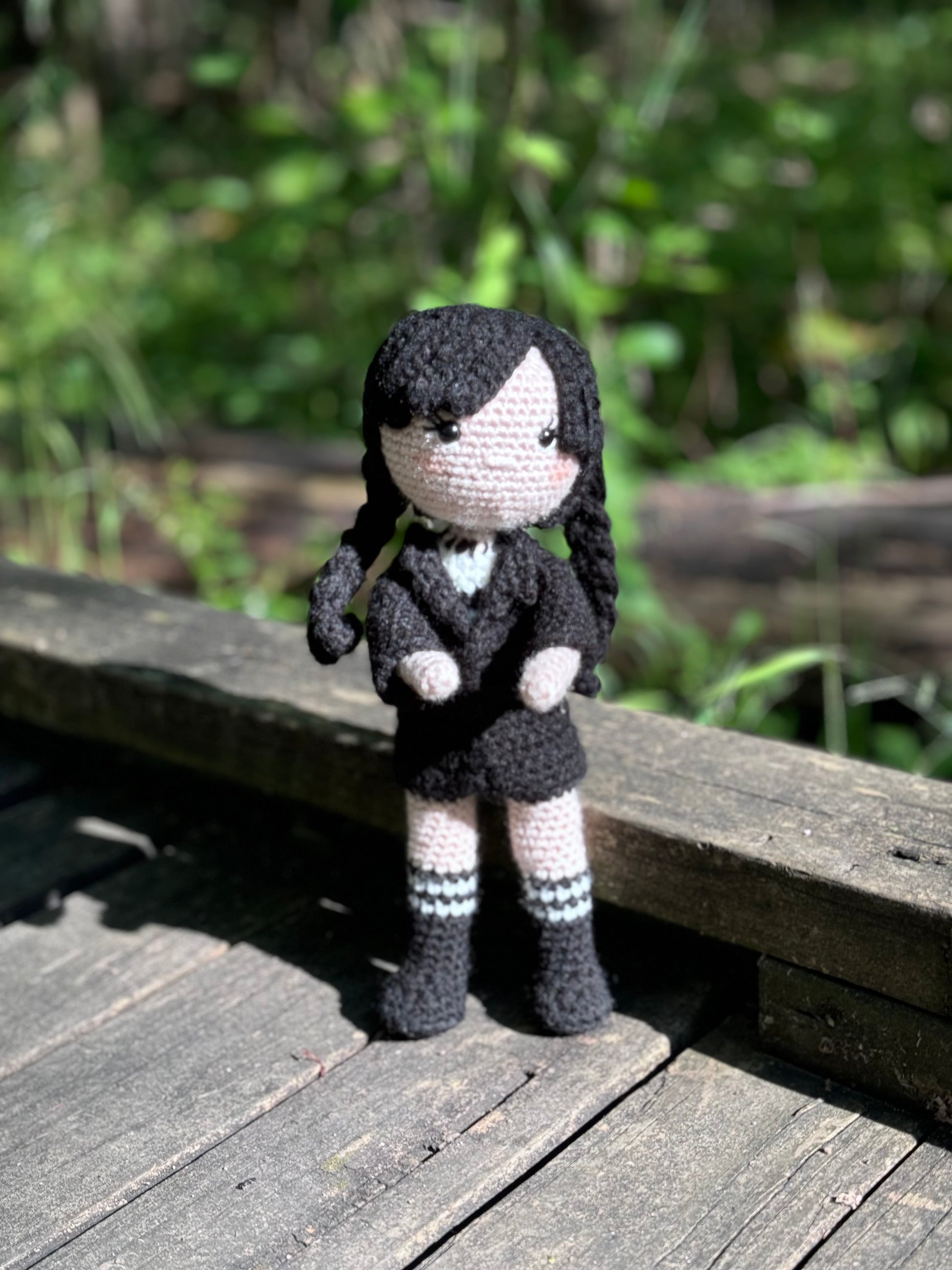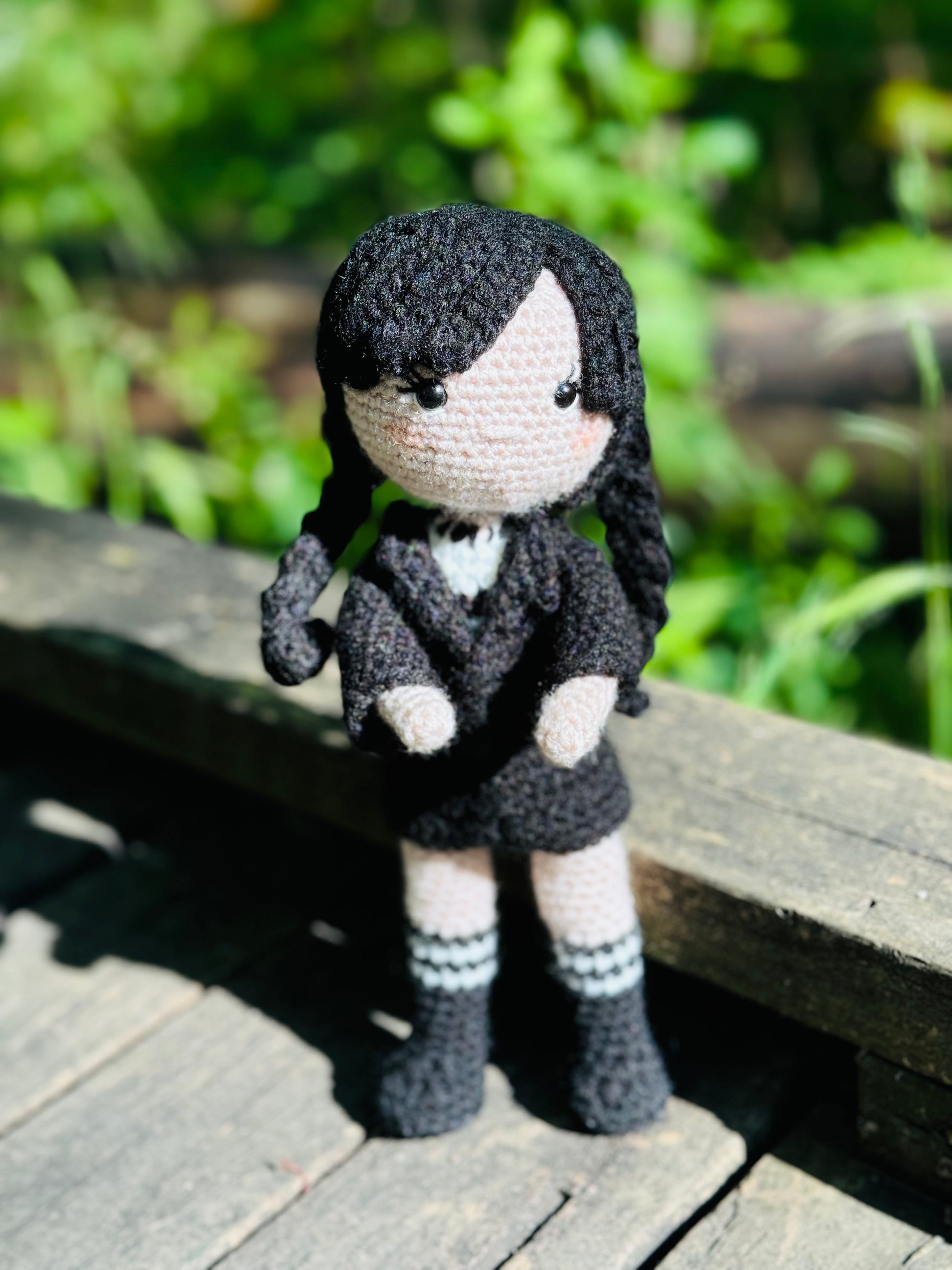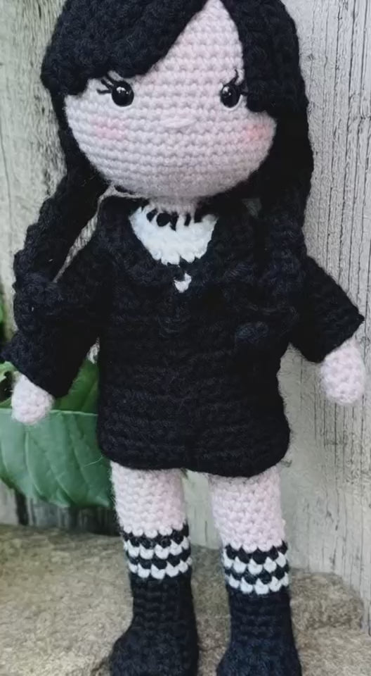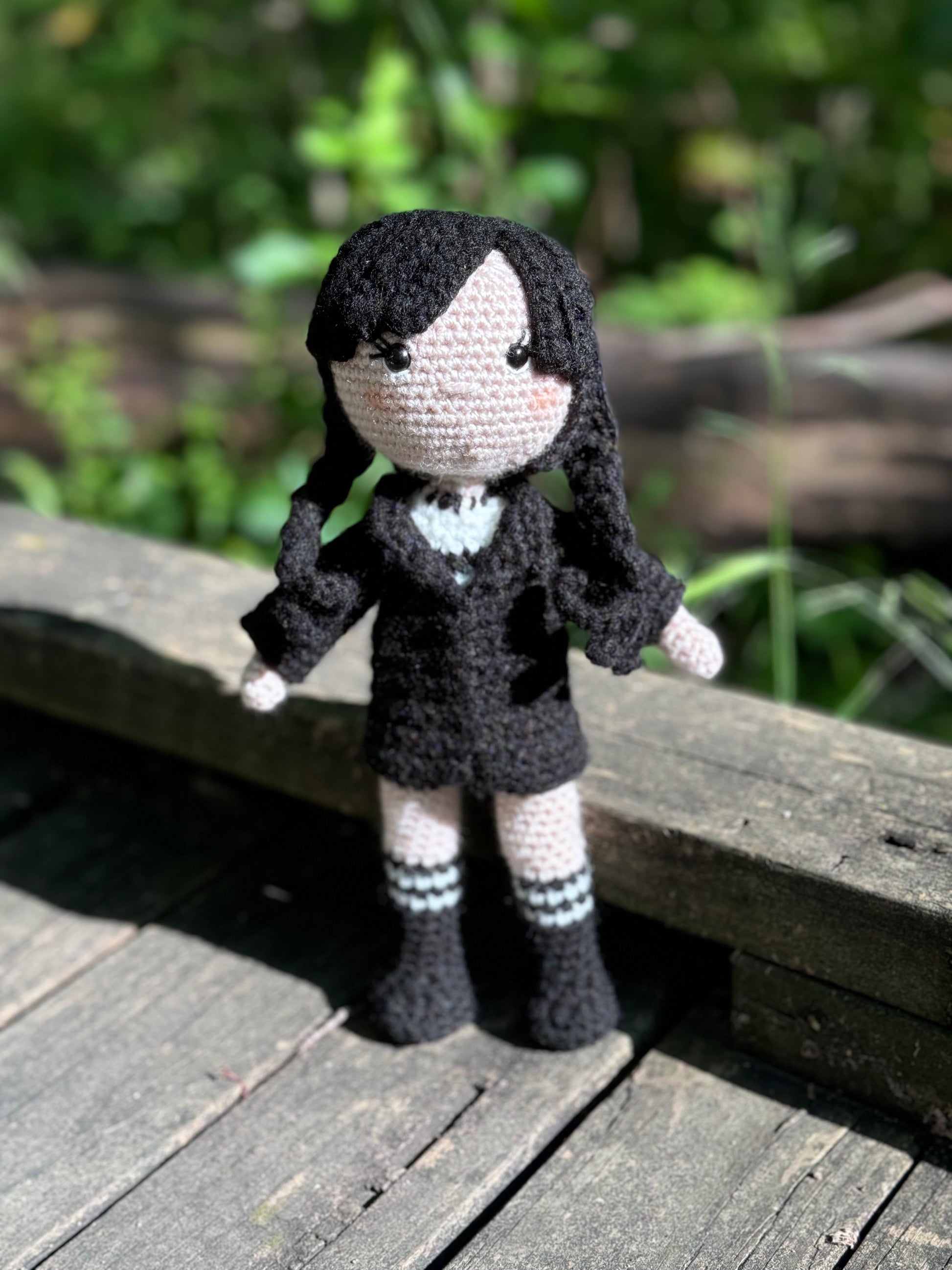 Introducing Wednesday Addams! She's a cute crochet doll made with love. She is around 10 inches tall with posable arms; which makes her great for hugging and playing with. Each doll is made specifically for each order to make sure that every little detail is perfect. To keep Wednesday in top shape just wash her gently in cold water and let her air dry.
